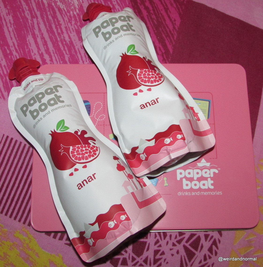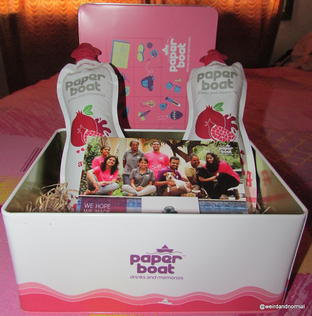 Paper Boat sent me a box which was a cute little pink one, that had these cute drawings that made me go awww and reminded me of my school days. Inside it had a lovely picture of the team behind Paper Boat, a fridge magnet, a letter and their newly launched Pomegranate juice.