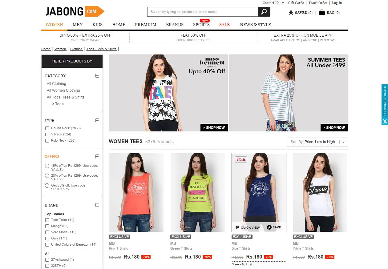Their filter options are also great as they segregate things gender wise, then departmental wise, there’s also a separate section for what’s new. Once you have filtered your choice of department like I did for Top, Tees and Shirts and then filtered it again to Tees, I was spoilt for over 3000 tee choices. The greatest part is that you can further filter as per type, color, brand, offers, price and sizes. Size for me is an issue because often I like a particular item but the size may or may not be available. So this filter helps me avoid the agony. 😛