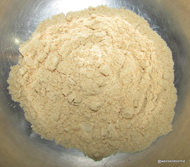 To begin, first grind the Marie biscuits in a mixer. Next pour the powdered Marie biscuits in a bowl.